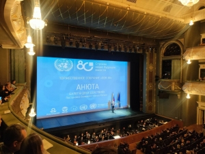 23 октября в Москве состоялось торжественное мероприятие по случаю 80-летия Организации Объединенных Наций, организованное совместными усилиями Информационного центра ООН в Москве, Российской ассоциации содействия ООН и Общественного комитета ООН-80. Торжественное мероприятие по случаю 80-летнего юбилея ООН состоялось на сцене Большого театра. С приветствиями в адрес всемирной площадки выступили министр иностранных дел С. В. Лавров, Генеральный секретарь ООН Антониу Гутерриш, ректор МГИМО А.В. Торкунов и директор Информцентра ООН в Москве В. В. Кузнецов. Представители Герценовского университета также были приглашены к участию в торжествах, поскольку наш университет имеет давние и тесные связи с этой организацией. Начиная с 2008 г., когда был подписан первый меморандум о взаимопонимании между ООН и РГПУ им. А.И. Герцена, университет развивает и поддерживает программу подготовки переводчиков для высшего руководства страны и международных организаций, и ООН всегда была и остается важным и ценным партнером в реализации образовательной программы Санкт-Петербургской высшей школы перевода Герценовского университета. Директор ВШП Анжелика Антонова, приглашенная на торжества, так прокомментировала важность юбилея ООН: «ООН – это уникальная площадка, всемирная организация, где страны за круглым столом дипломатическим путем решают свои разногласия и строят совместное будущее. Санкт-Петербургская высшая школа перевода за 17 лет своего существования подготовила немало квалифицированных переводчиков для ООН, способствуя таким образом многостороннему и равноправному диалогу: уже 29 выпускников ВШП работают в штате переводческих служб Секретариата ООН: в Штаб-квартире ООН в Нью-Йорке и Отделениях ООН в Женеве, Вене и Найроби. Многие выпускники работают на краткосрочных контрактах в переводческих службах ООН или в ее дочерних организациях. Мы гордимся своим вкладом в построение многополярного и равноправного мира». После торжественной части участников церемонии порадовали балетом Ленинградского композитора Валерия Гаврилина «Анюта». От Герценовского университета на церемонии присутствовала директор Санкт-Петербургской высшей школы перевода А.М. Антонова. Школа за 17 лет своего существования подготовила 29 штатных переводчиков ООН. Одной из выпускниц ВШП является внучка композитора Валерия Гаврилина — Анастасия Андреевна Гаврилина, которая сейчас работает переводчиком в Отделении ООН в Женеве.